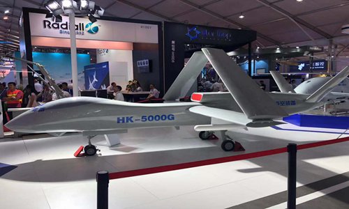A HK-5000G unmanned aerial vehicle on display at Airshow China 2018 in Zhuhai, South China's Guangdong Province with its wings folded. Photo: Liu Xuanzun / GT