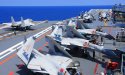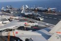 This is the scene after all aircraft are recovered and pushed from the foredeck to the stern for refueling, rearming, and a new departure: